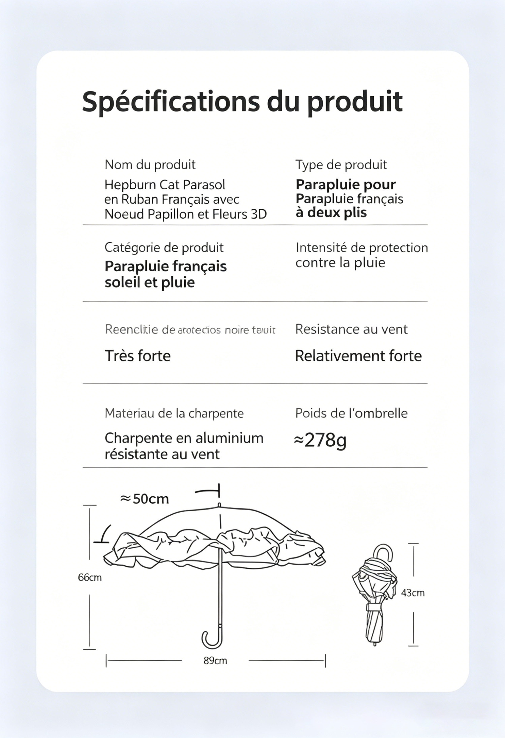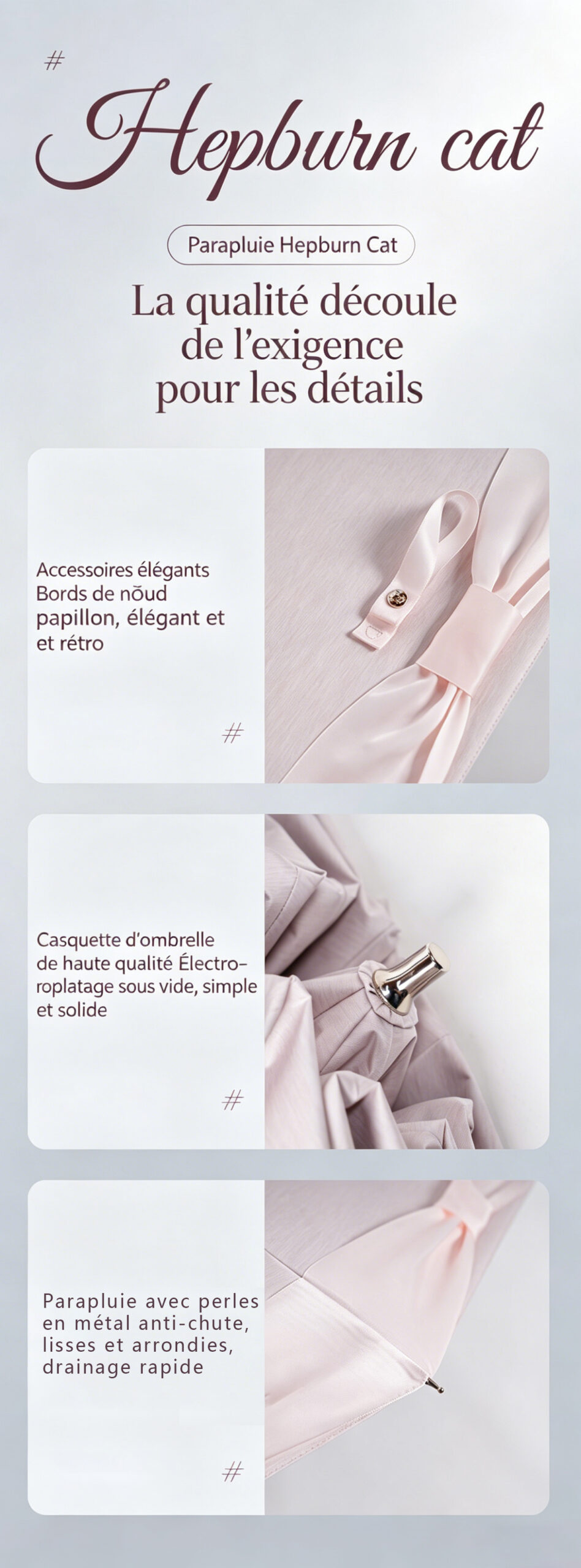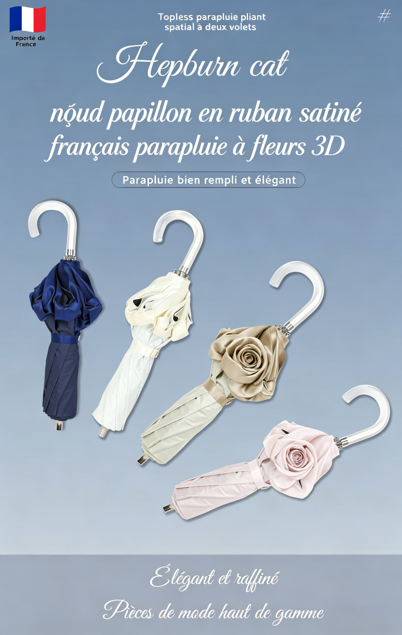 Découvrez l’élégance à la française avec ce parapluie chic et féminin, signé Hepburn Cat. Son design à double couleur avec nœud papillon en ruban satin apporte une touche romantique et raffinée à toutes vos tenues quotidiennes. Idéal comme accessoire de mode, il allie beauté et praticité pour la ville, les déplacements ou les sorties élégantes.